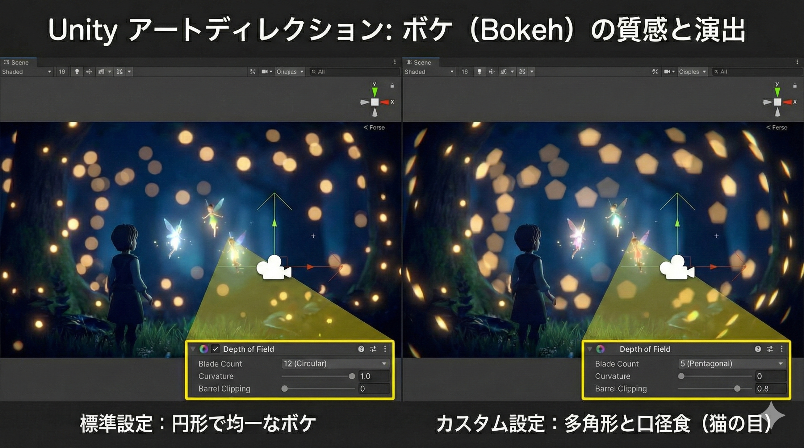 現実のレンズには「絞り羽根」というパーツがあり、その枚数や形状によってボケの形が変わります。Unityの “Depth of Field” コンポーネントにある詳細設定を見てみましょう。