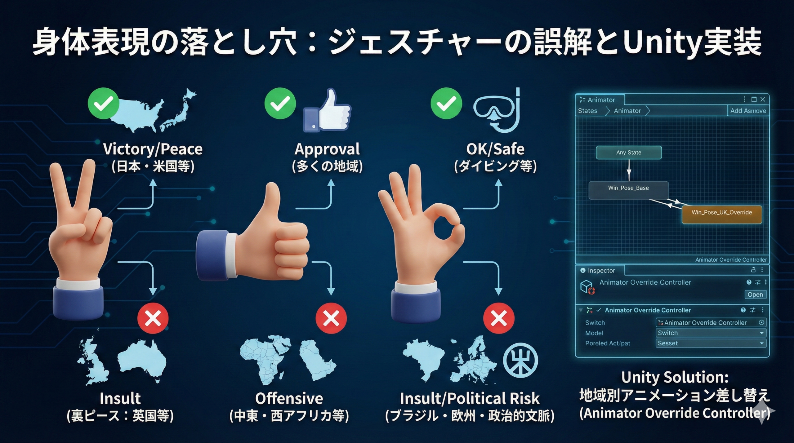 これらのジェスチャーをグローバル配信でどう扱うべきか。すべてを排除するのではなく、 ”地域に応じたアニメーションの差し替え” をUnityの機能でスマートに実装しましょう。