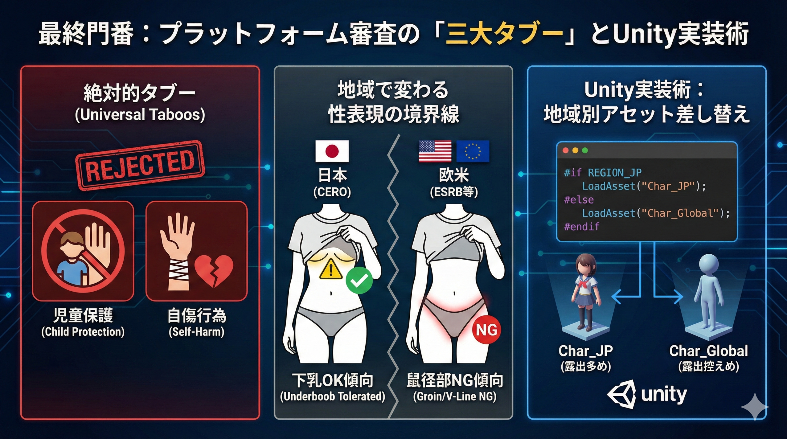 今回は、この三大タブーの具体的な基準と、地域ごとに異なる規制の「境界線」をUnityでどう乗り越えるかを解説します。