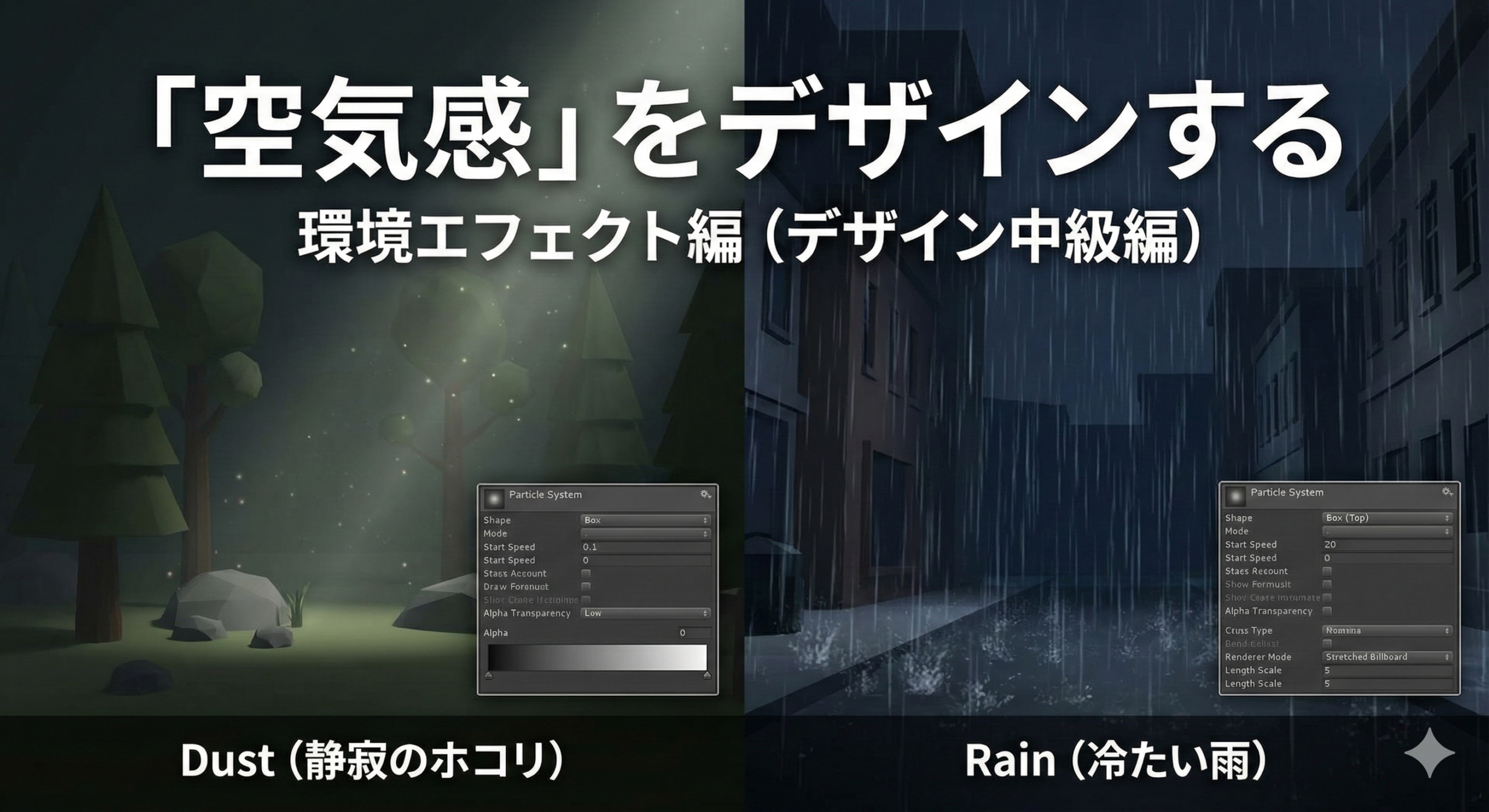 同じParticle Systemでも、設定ひとつで「静寂」も「激しさ」も表現できます。 あなたの作った3Dシーンに、ぜひこの「空気感」をプラスしてみてください。