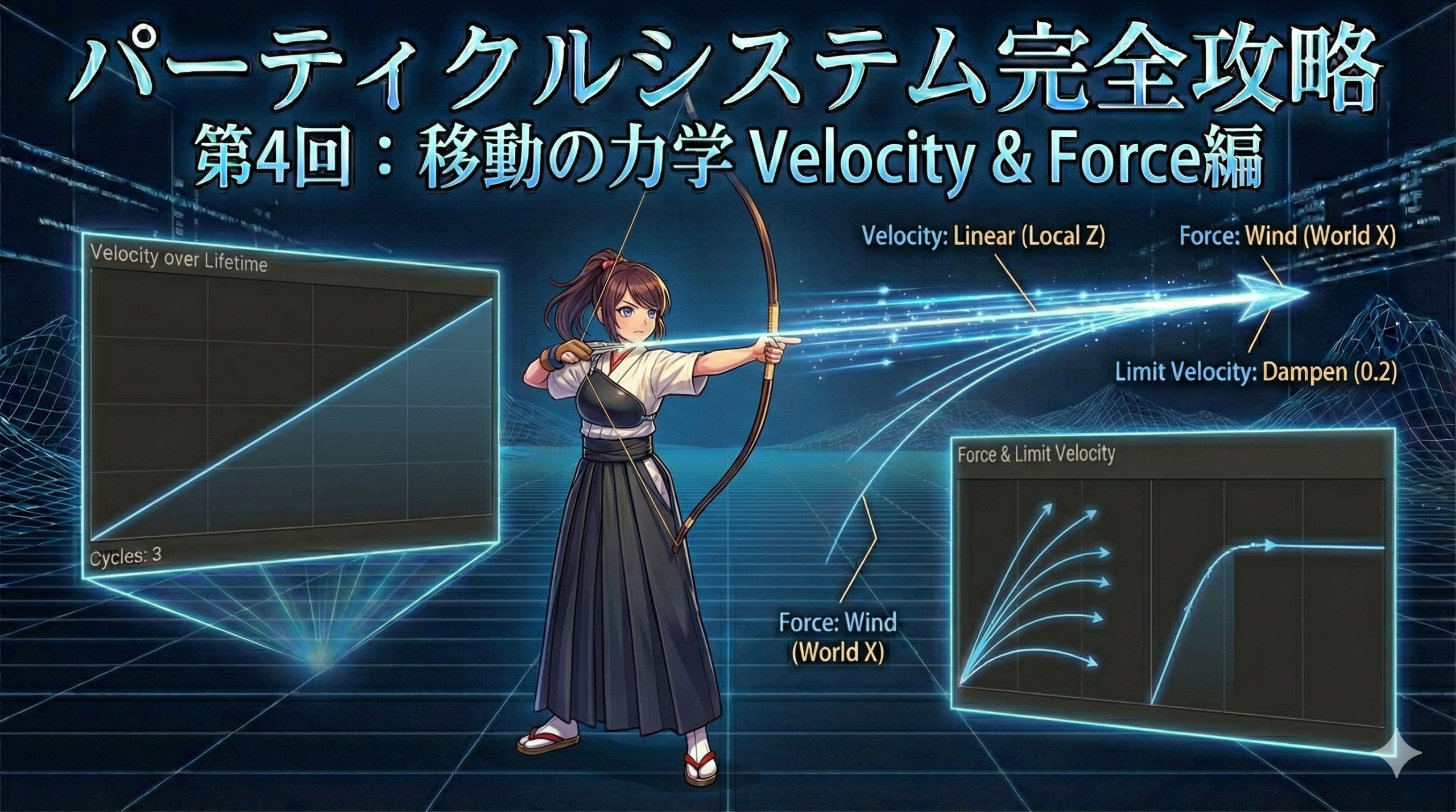 今回は、弾道計算のような精密な動きから、煙のようなゆらゆらとした漂いまでを制御する “Velocity over Lifetime” 、 “Force over Lifetime” 、そしてブレーキの役割を果たす “Limit Velocity over Lifetime” を徹底解説します。